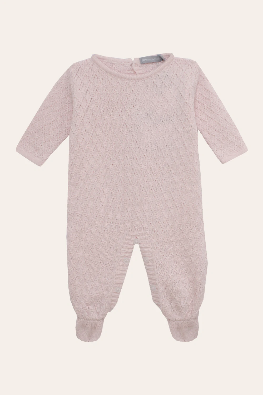 Macacão de tricot com ponto mini aram em toda a peça, abertura nas costas e entrepernas de botão.