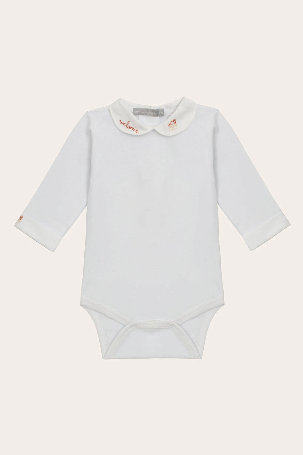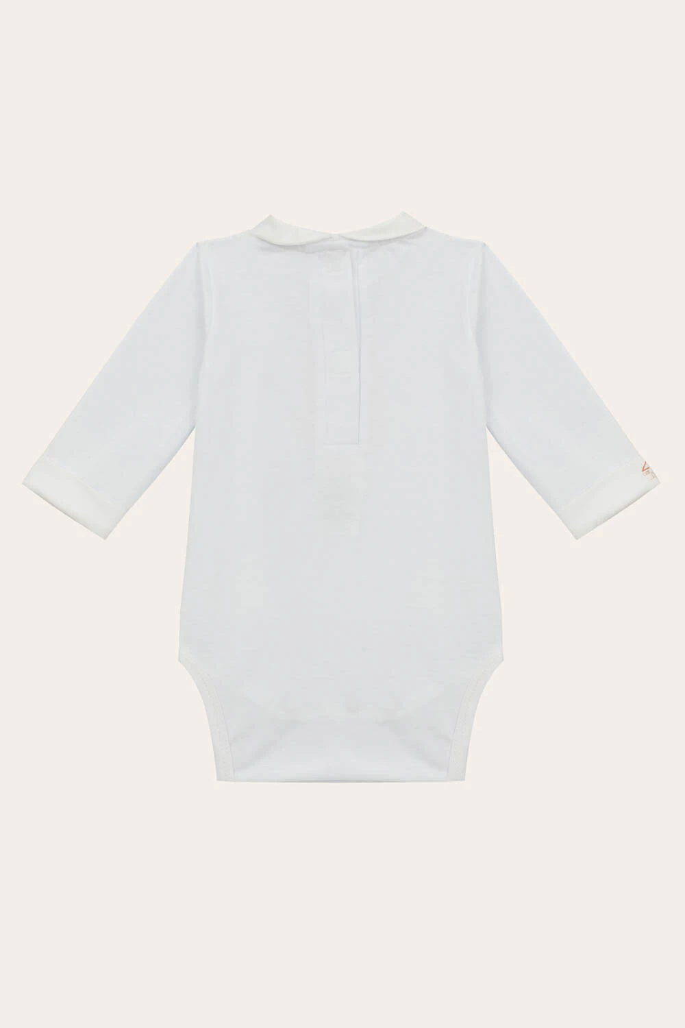 Body com gola e punho de fustão, detalhe de bordado a máquina. Abertura nas costas feita em velcro, facilita o vestir e não machuca o bebê.