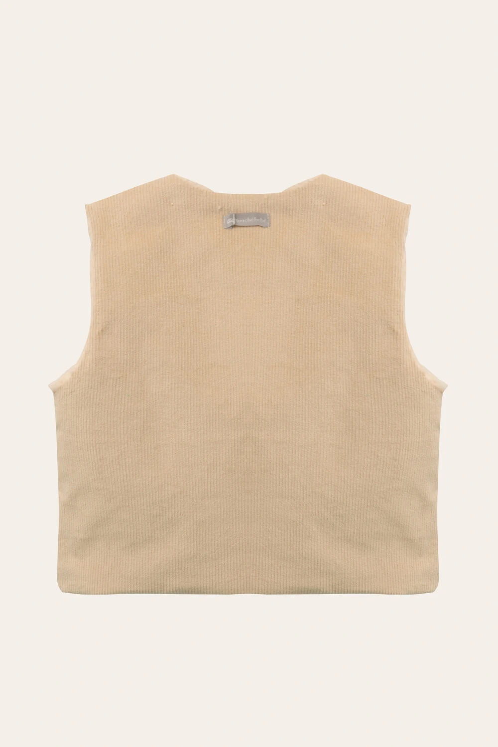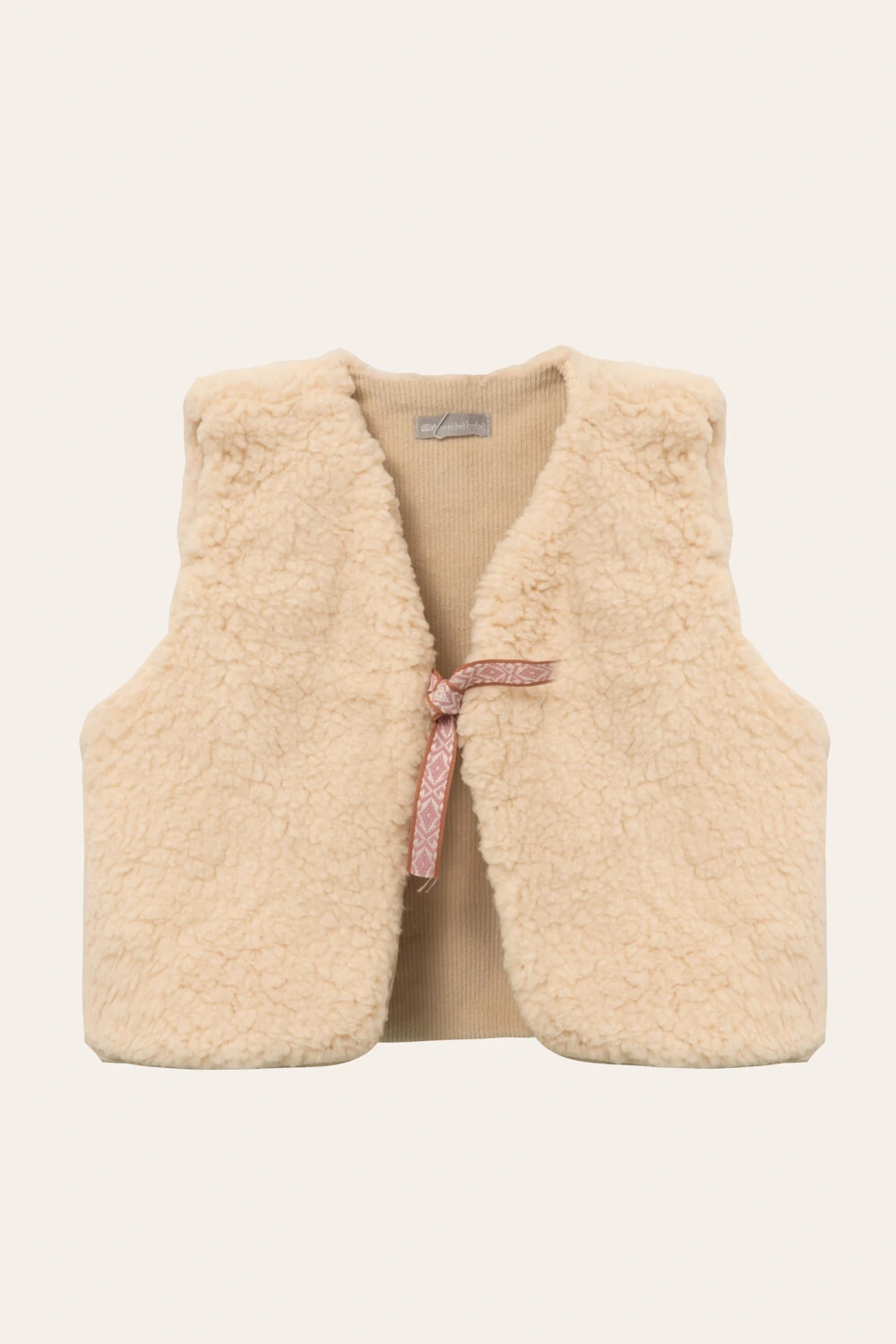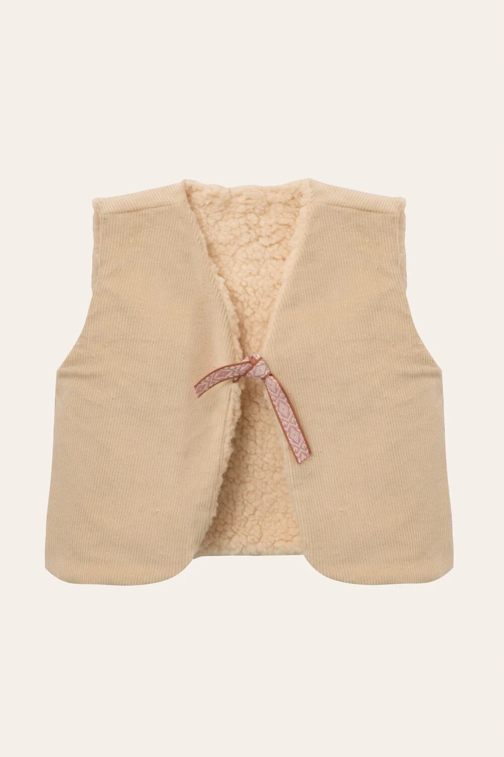 Colete Marise dupla face com pelinhos que imitam um carneirinho de um lado e veludo cotelê do outro. Para fechar uma fita bordada em tons rosé.