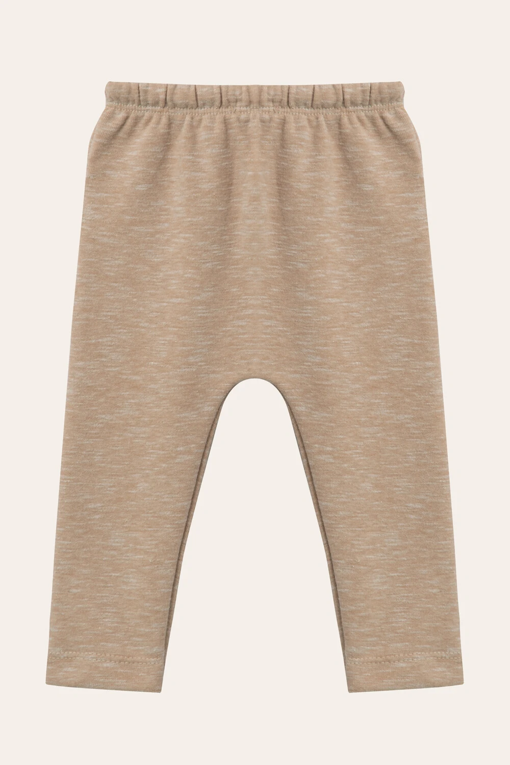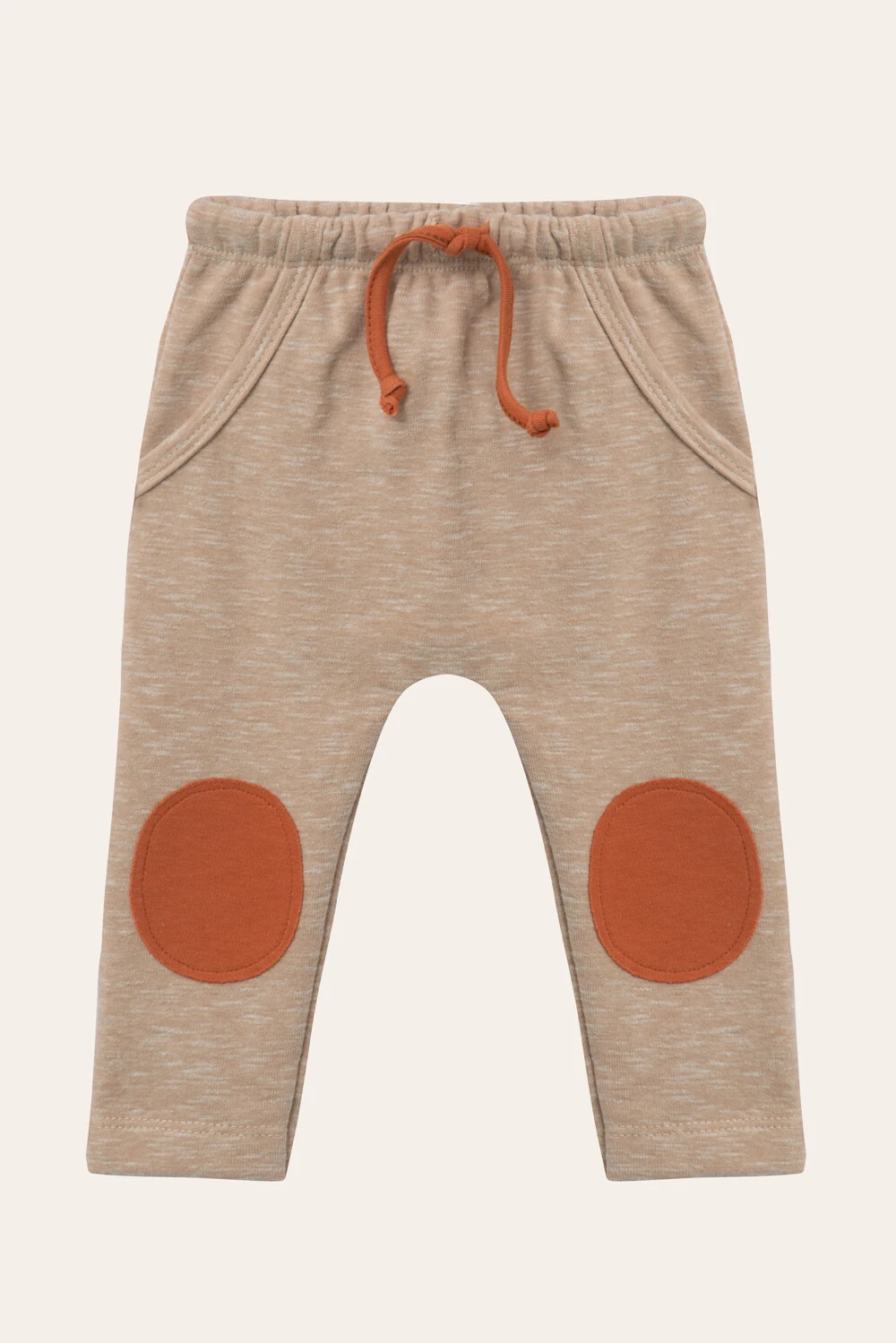 Calça de moletinho flamê em modelagem saruel com joelheira e bolso falso. Cós de elástico com cordão e regulagem.