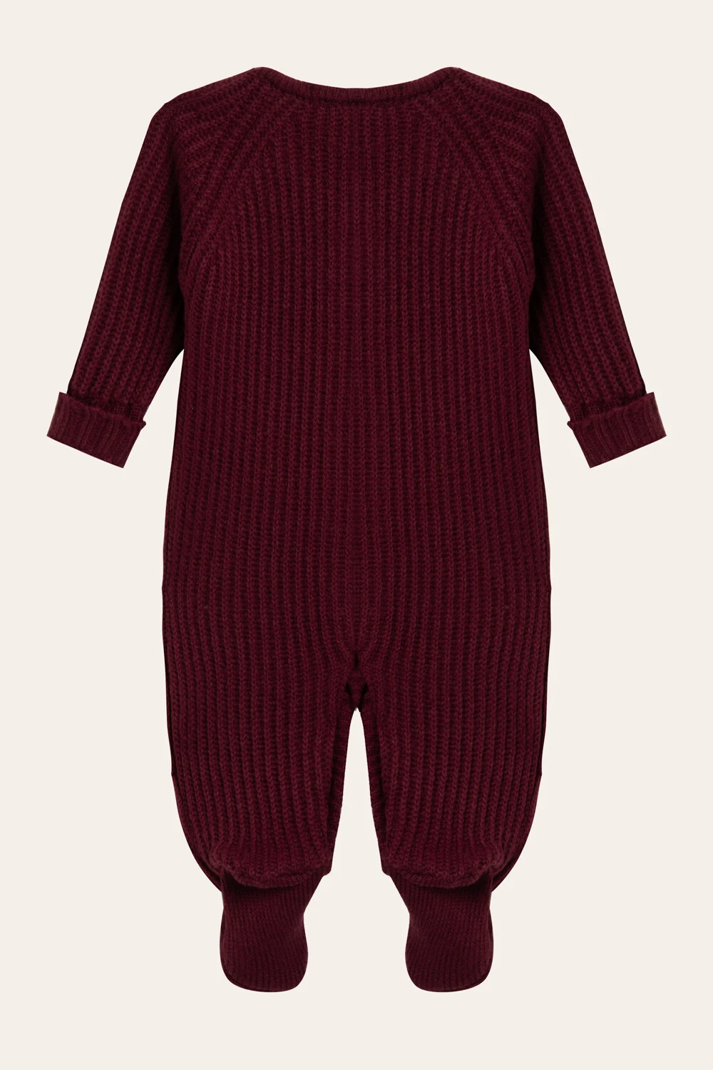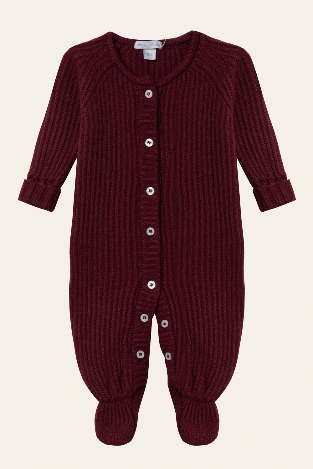 Macacão em lã com ponto delicado, abertura frontal em botões e mangas de punho largo dobrado. Perfeito para quem chega no frio.