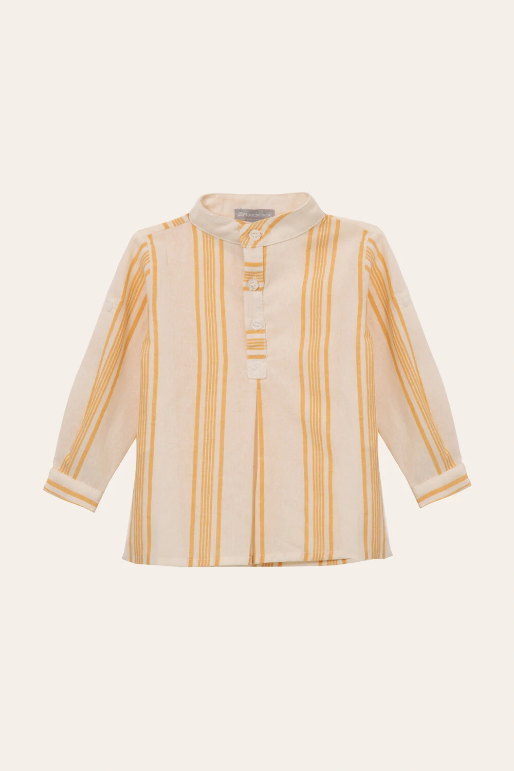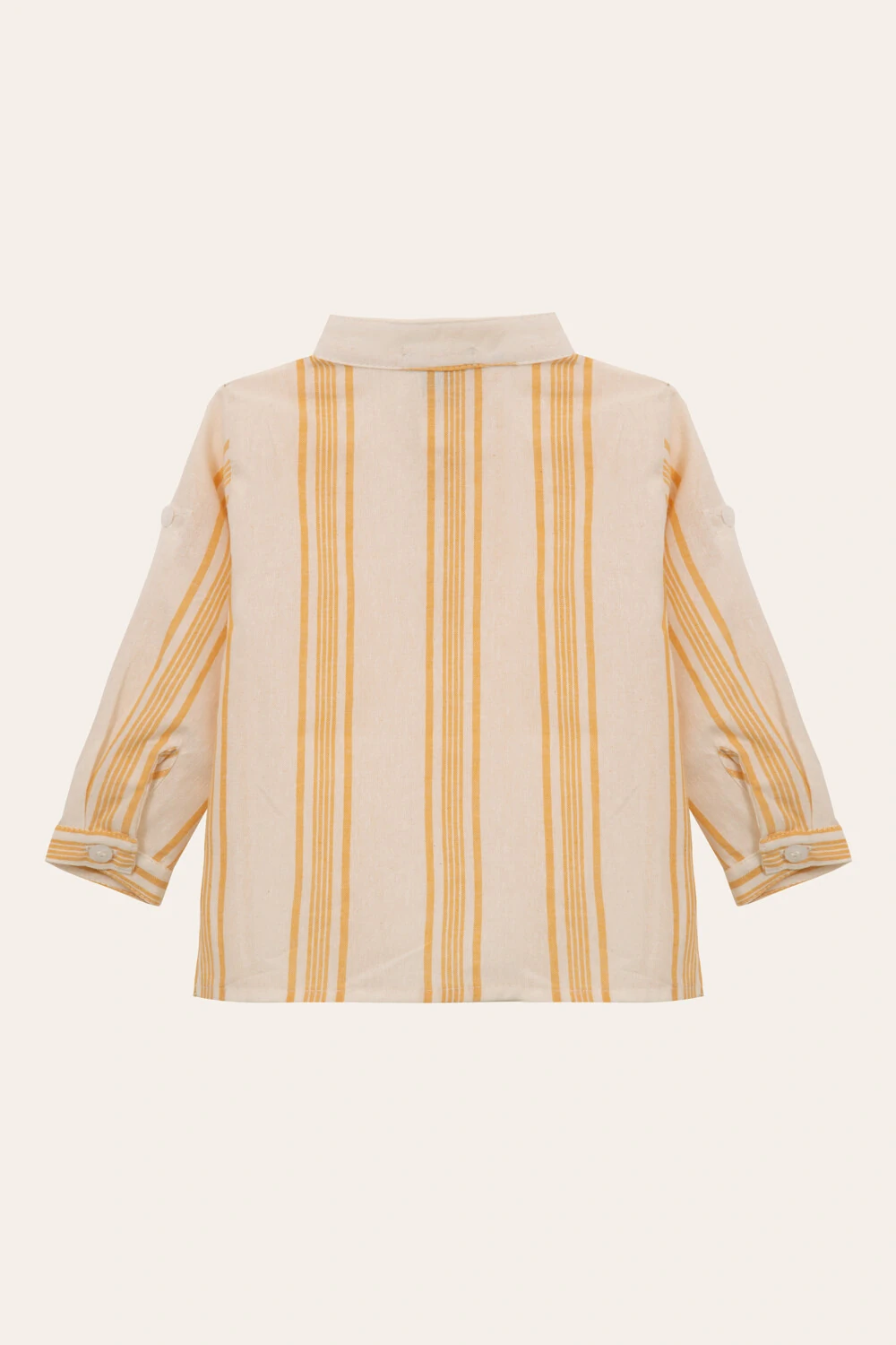 Camisa Gola Padre em tecido listrado com toque delicioso, prega frontal e martingales nas mangas.