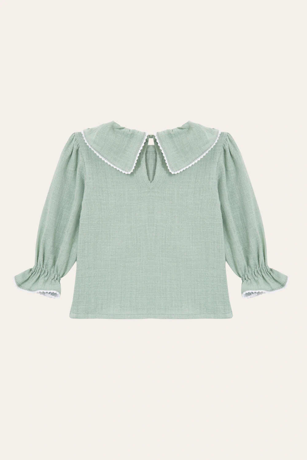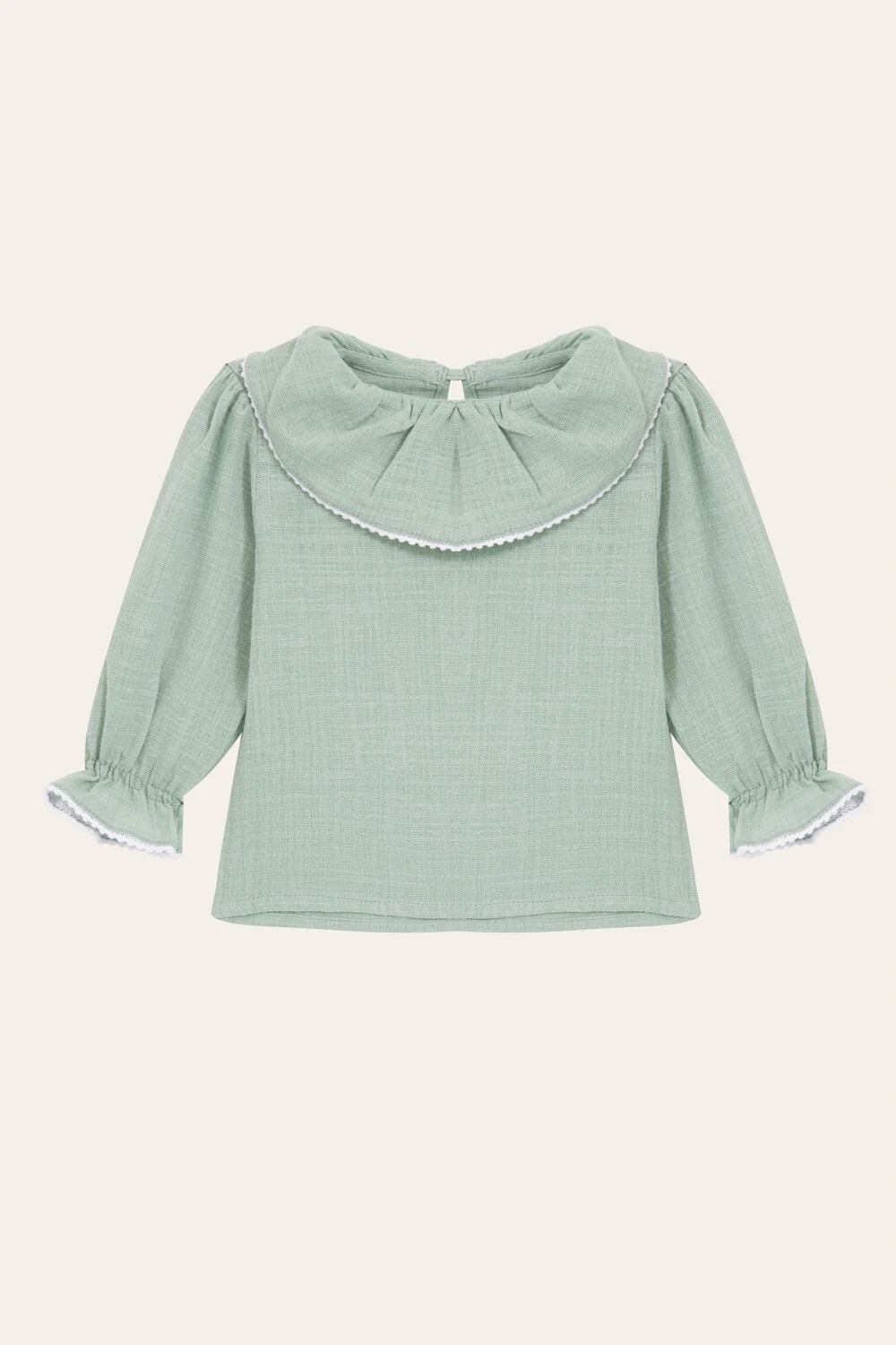 Blusa de modelagem retinha com gola delicada, manga longa com elástico e babadinho no punho ,em tecido leve misto de algodão com linho. Abertura nas costas em formato de gota. Uma peça clássica e atemporal que deixa qualquer look mais charmoso.