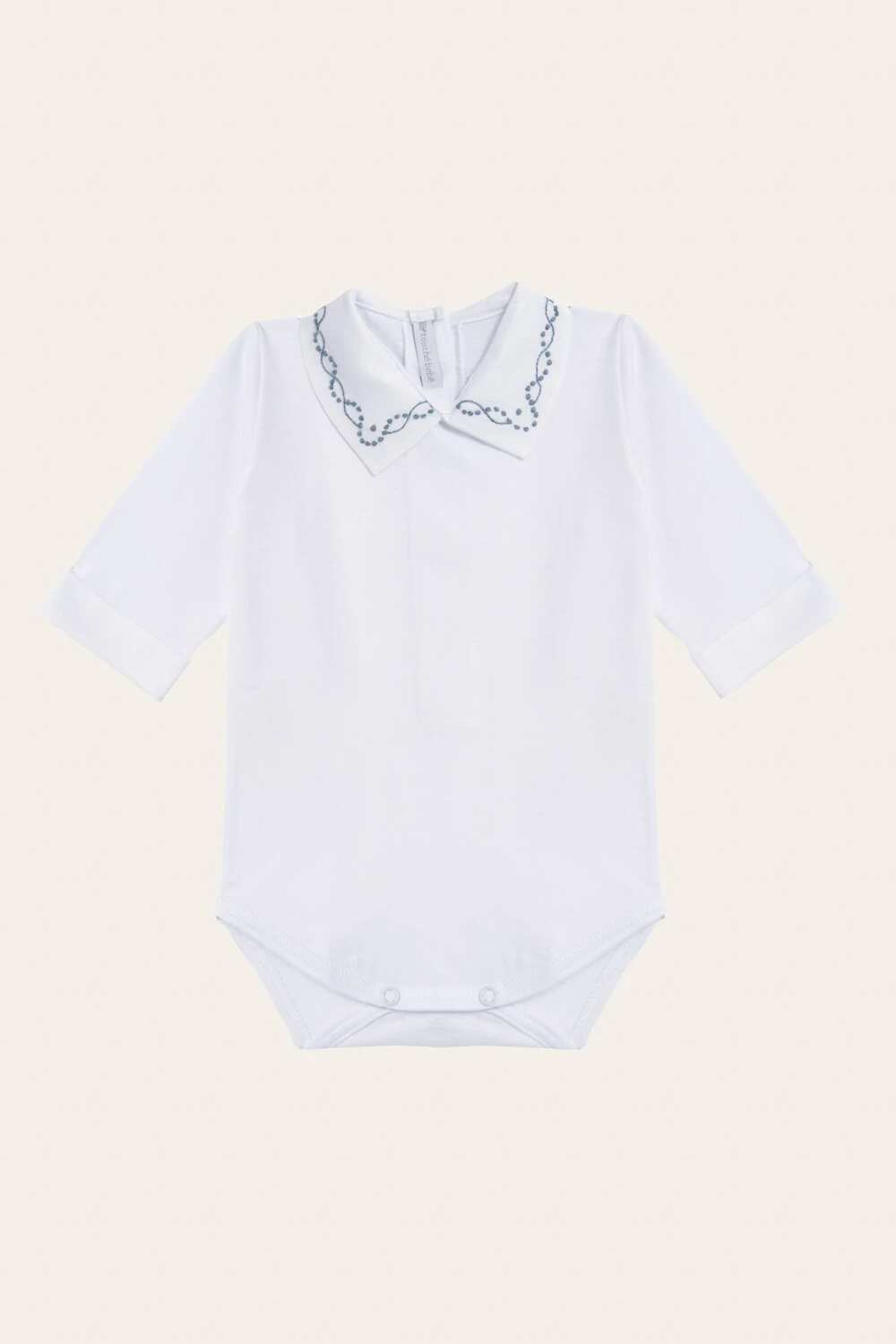 Body com gola e punho 110 100% algodão, com gola e punho de fustão bordado a mão. Abertura nas costas de velcro, fácil de vestir e não machuca o bebê. Abertura no entrepernas de botão de pressão.
