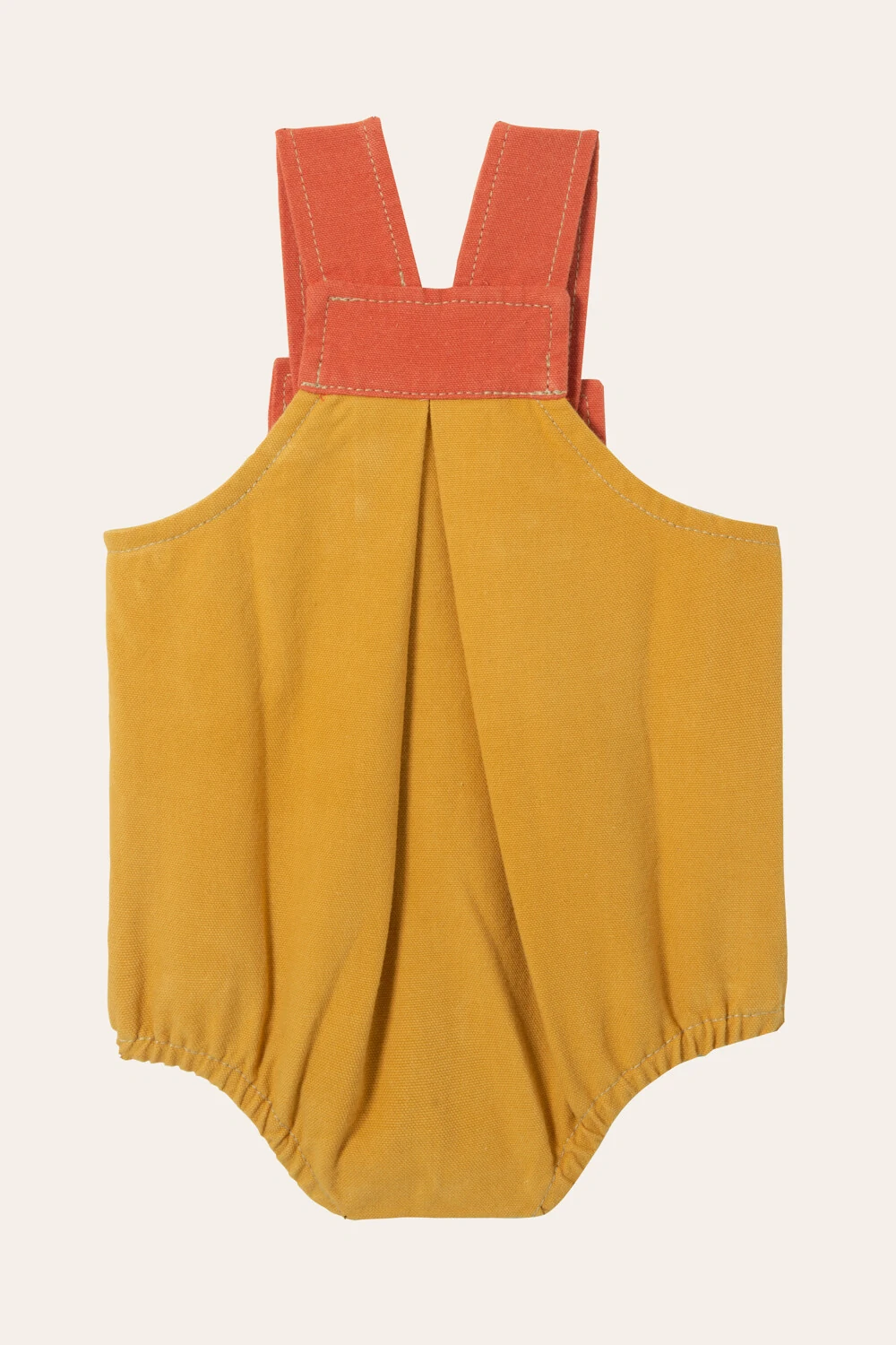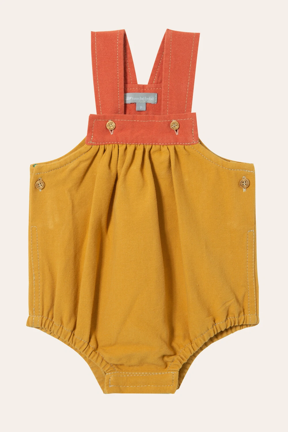 Em sarja de algodão sustentável, em uma linda combinação de de cores quentes, esta jardineira deixa qualquer look com ar vintage. Suas alças tem regulagem de botões de madeirinha. Para facilitar o vestir e as trocas de fralda a peça possui abertura de botões no entrepernas e um botão de cada lado nas laterais.