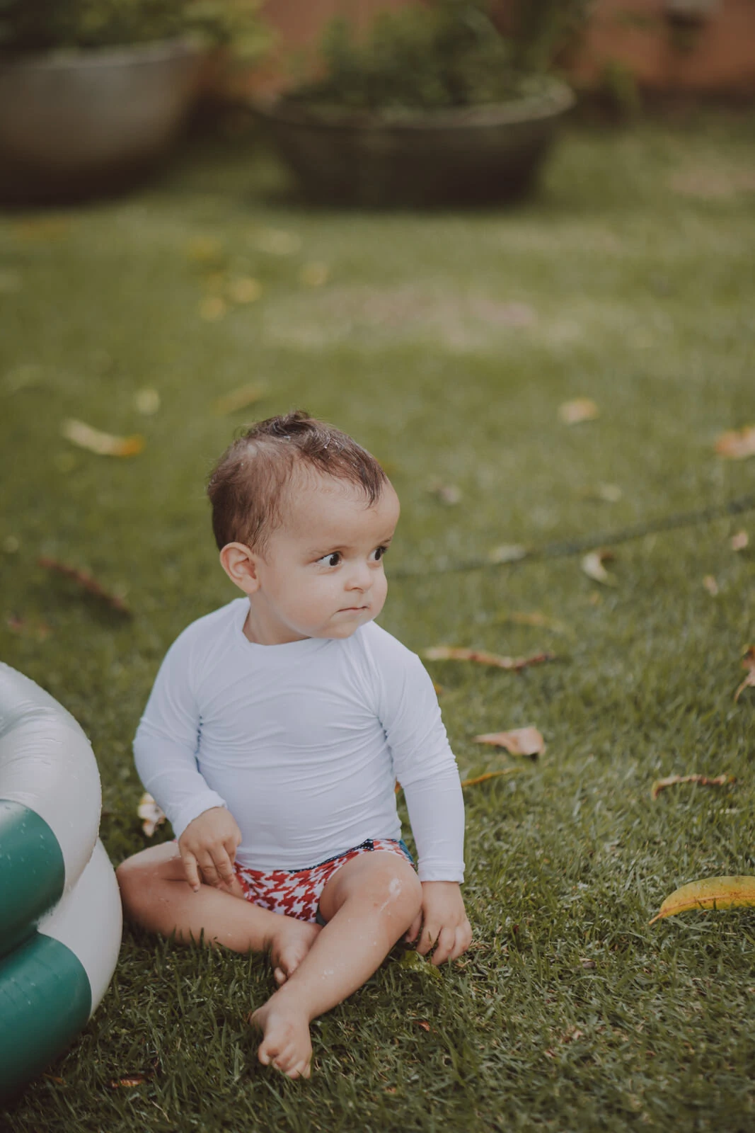 Camiseta manga longa com cavas raglan, feita em tecido leve e macio com proteção UV80, ótimo para praia, piscina e atividades ao ar livre.