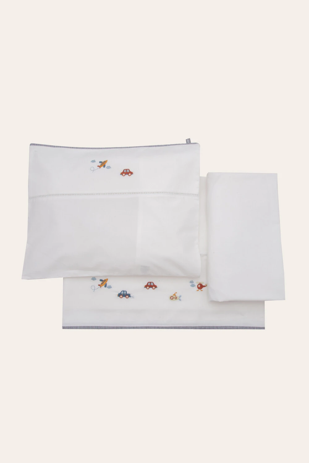 - 1 conjunto lençol tamanho berço, feito em percal 100% algodão, é composto por 3 peças: lençol de cobrir com faixa bordada de fustão, fronha com faixa de fustão bordada e lençol de elástico.