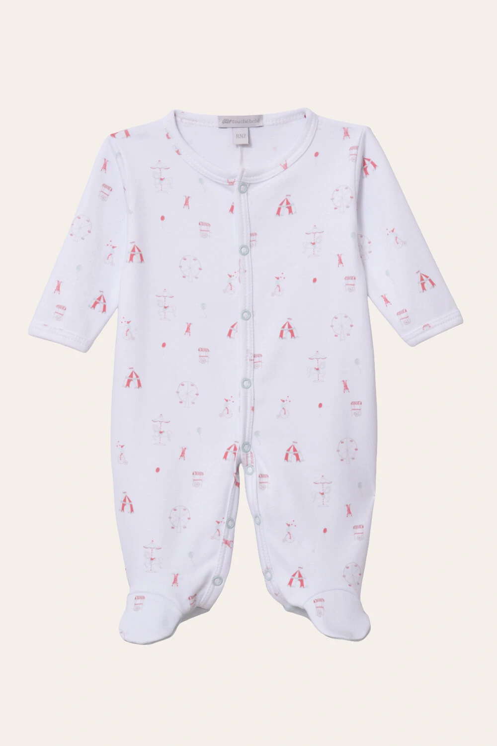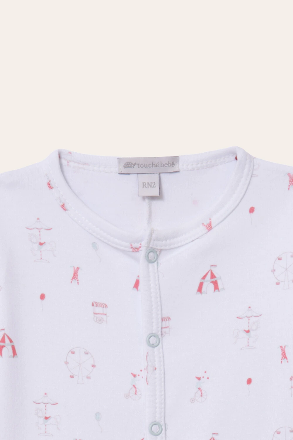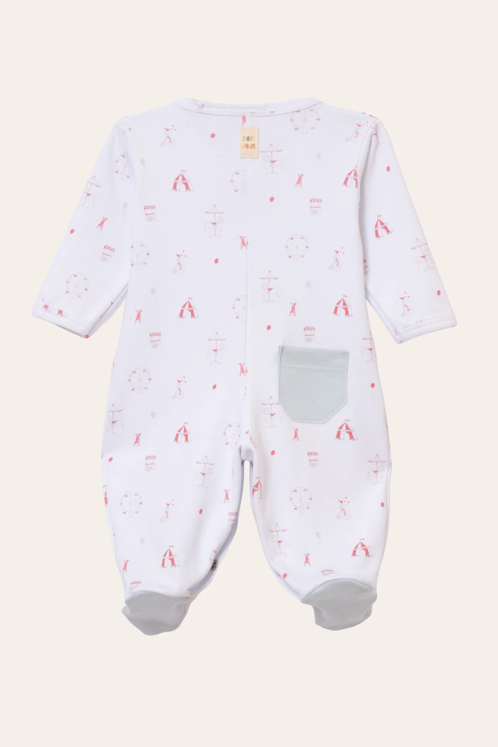 Macacão de malha de algodão egípcio com estampa exclusiva touché bebê, toque macio e muita durabilidade, uma peça delicada para um soninho perfeito. O macacão tem detalhes em malha azul clarinho e botões de pressão que facilitam o vestir e as trocas de fralda.