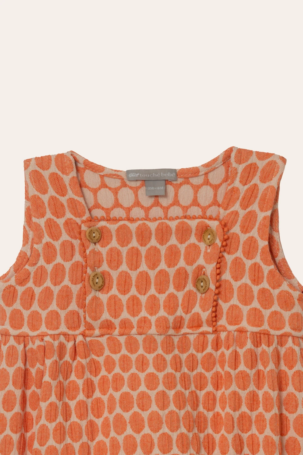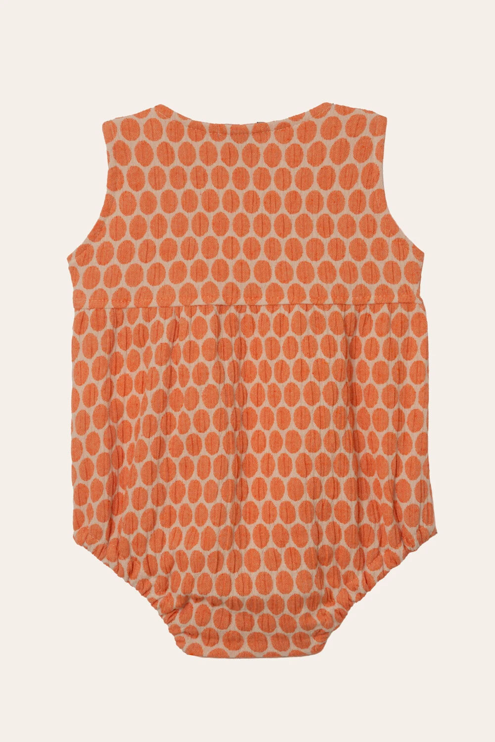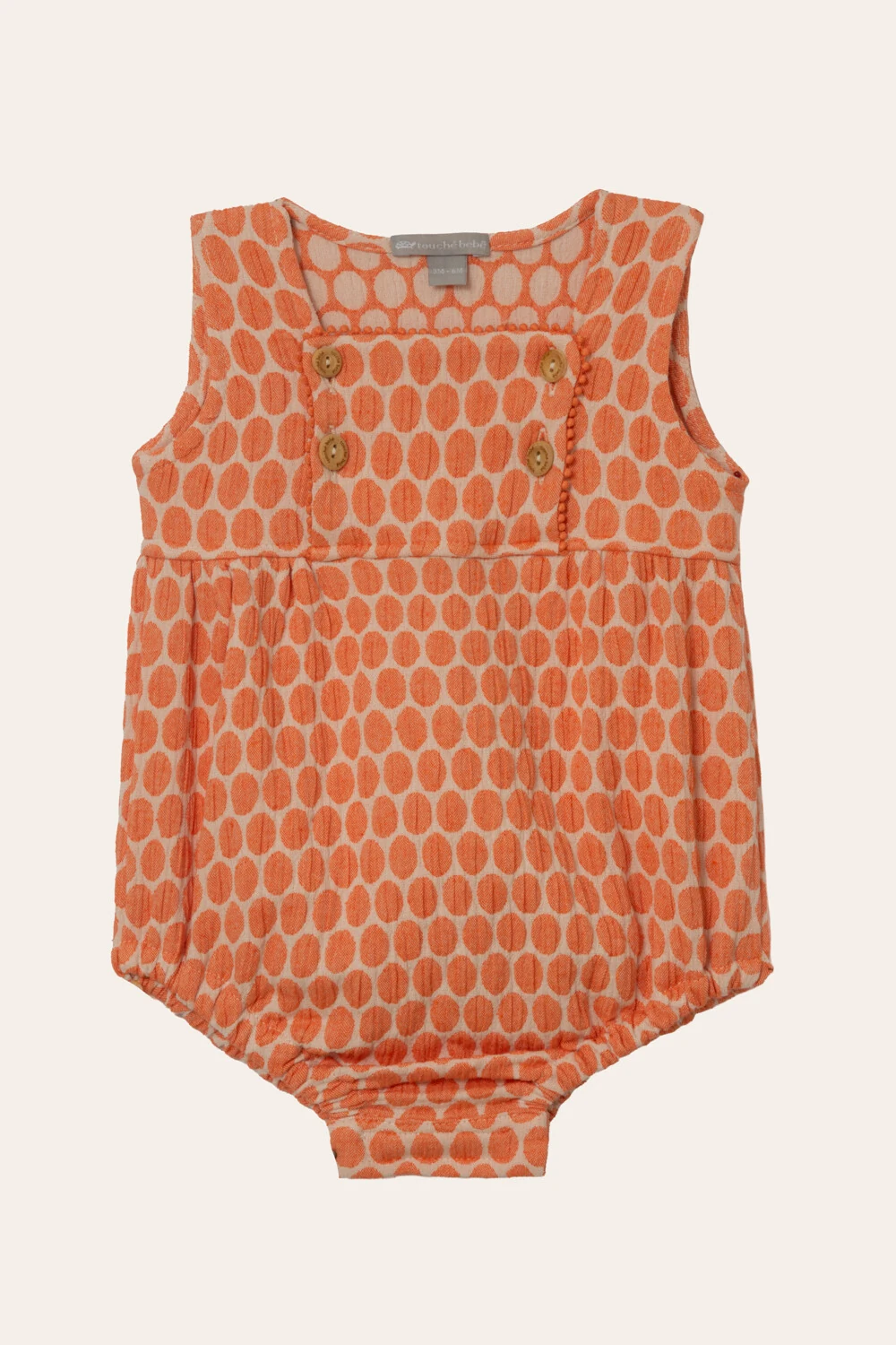 Pimpão fresquinho em tecido jacquard de bolinhas com delicado detalhe de sianinha no peito. Abertura de botões de pressão no entrepernas facilitam o vestir e as trocas de fralda