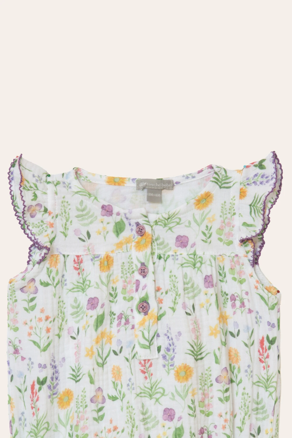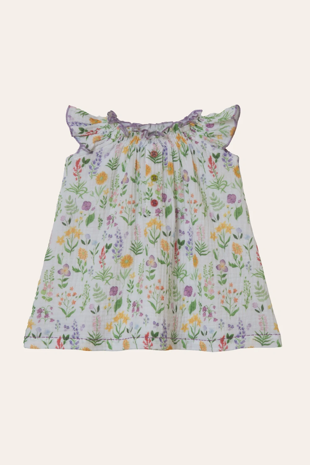 Vestido soltinho, com detalhe de lástex e botões coloridos, feito em gaze de algodão com estampa exclusiva. Uma peça delicada, bem leve, para curtir o verão e o calor com muito charme.