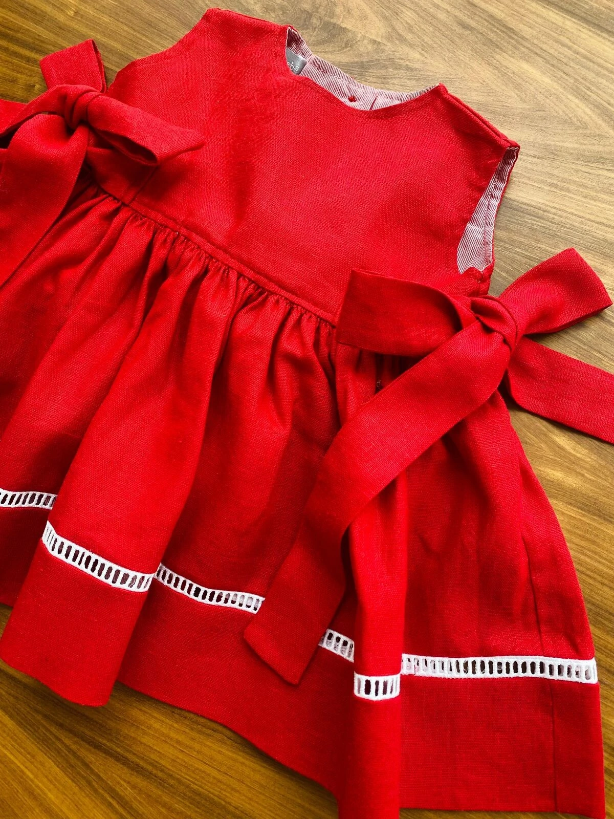 Vestido rodado em linho vermelho para deixar sua bebê linda e especial. Modelo com laços na lateral e abertura nas costas. Acompanha calcinha até o modelo 12 a 18 meses.
