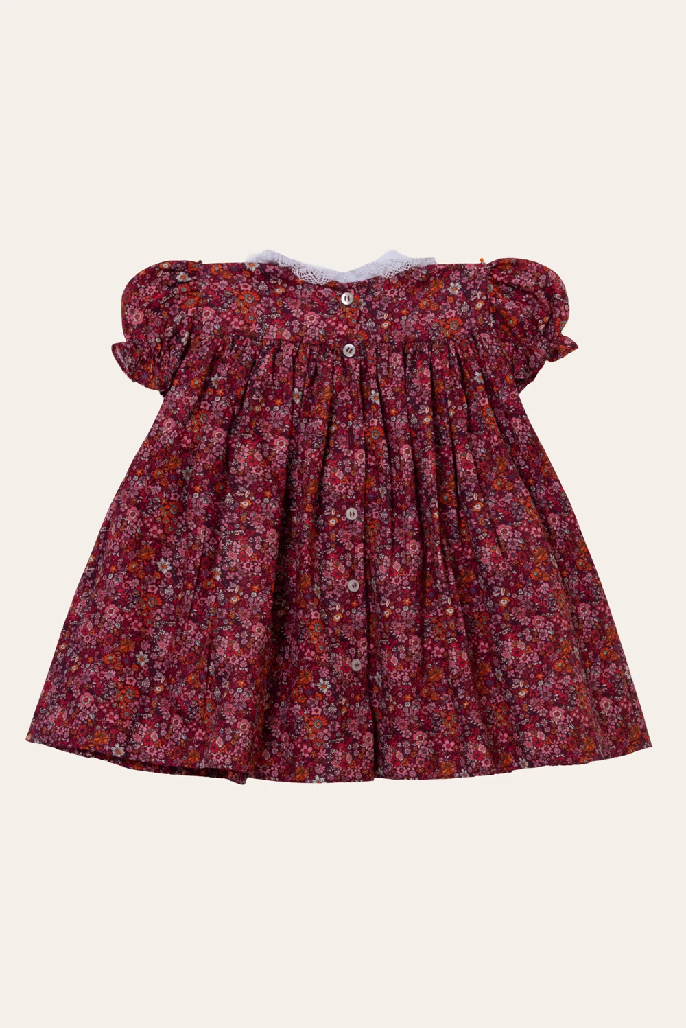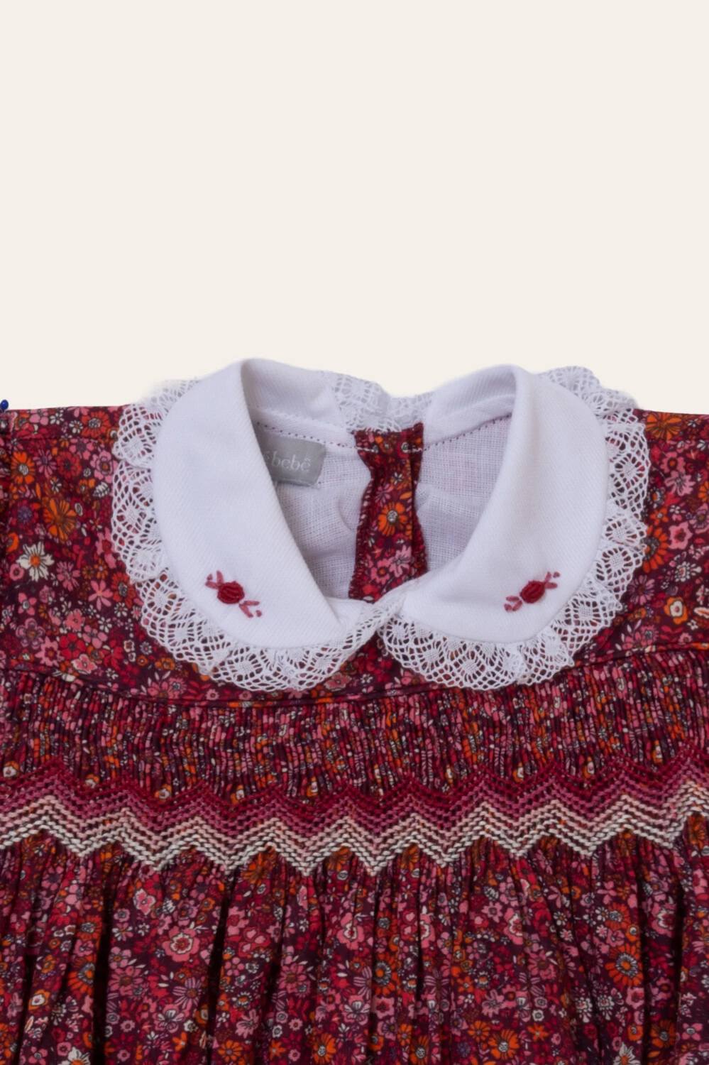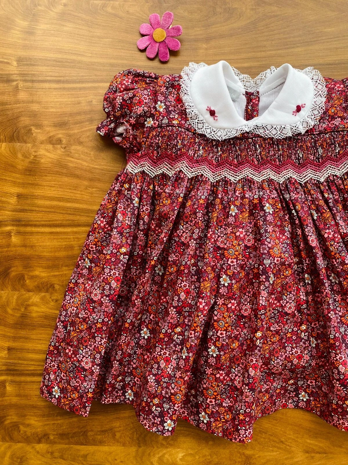 Vestido de algodão com estampa floral miudinha com fundo rosa, gola de fustão e bordado casinha de abelha no peito .Acompanha calcinha até o tamanho 9 a 12 meses (não acompanha Fita para Laço) Acompanha Fita para Laço à partir do tamanho 12-18 (Não acompanha calcinha)