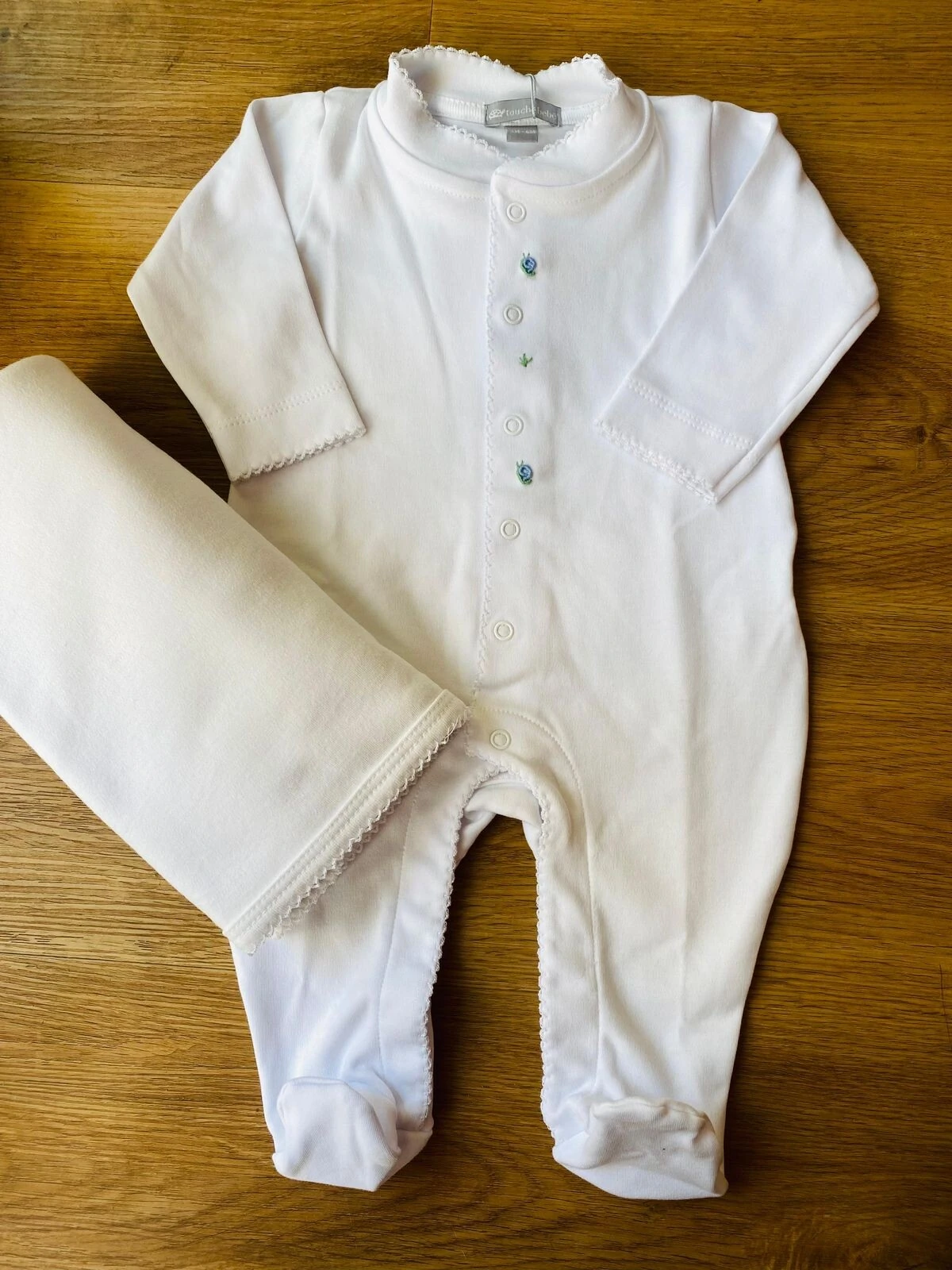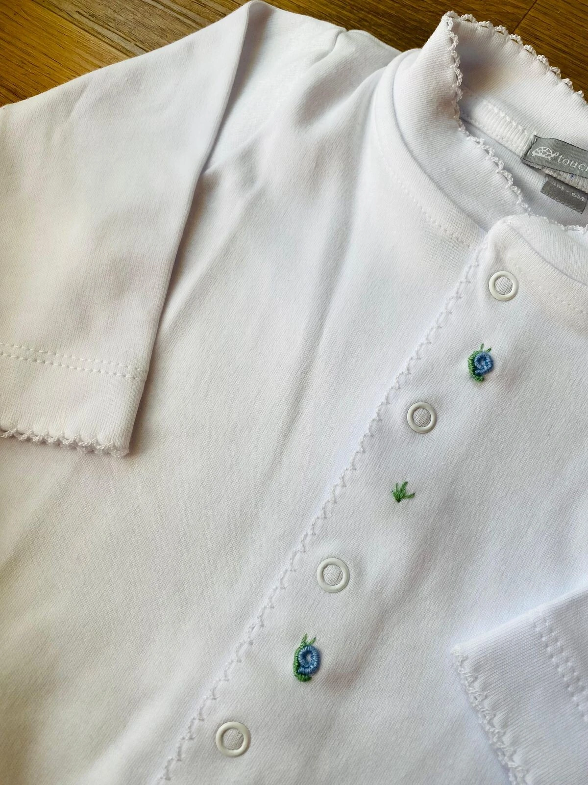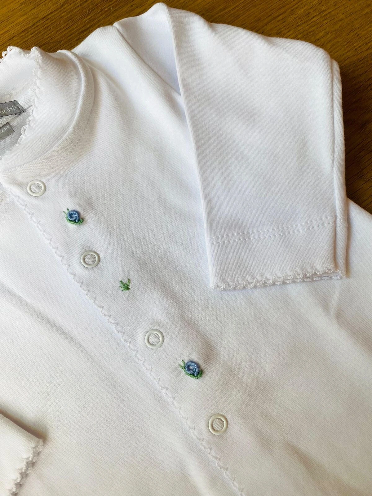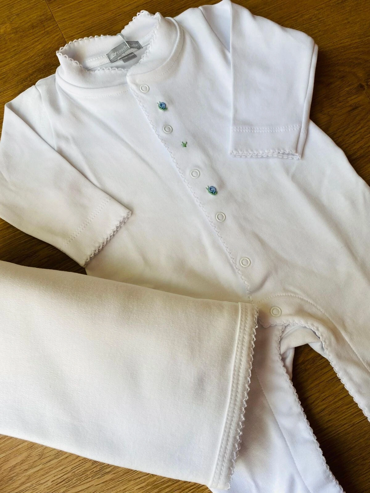 Macacão em algodão egípcio - um algodão de fibra longa, de alta durabilidade e toque especial. Abertura frontal fácil e prática para todas as horas e um delicado bordado a mão de caracol.