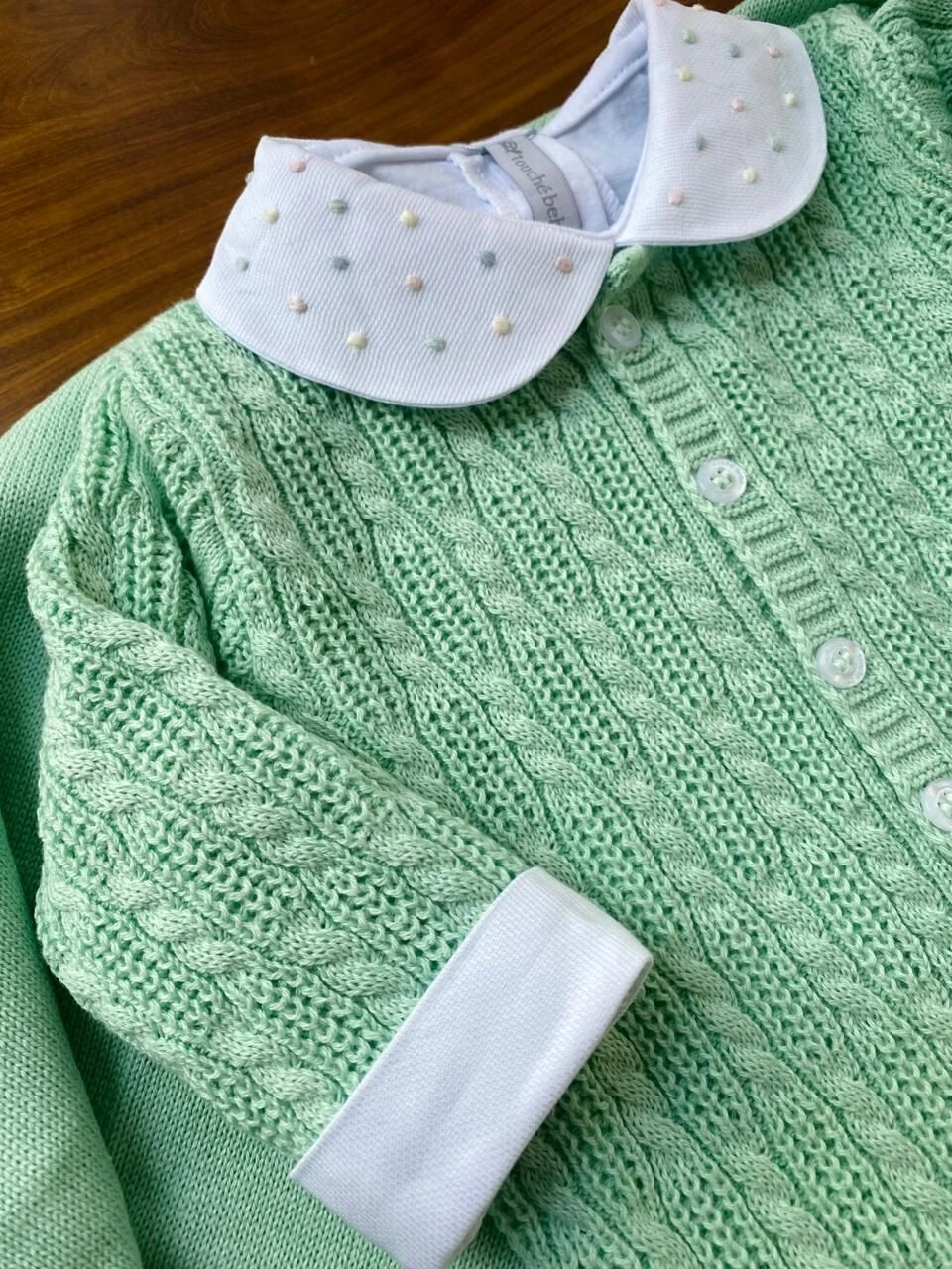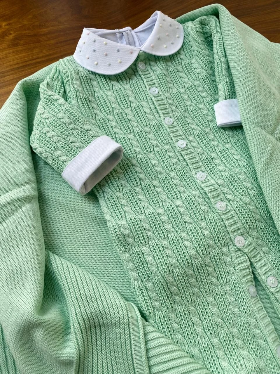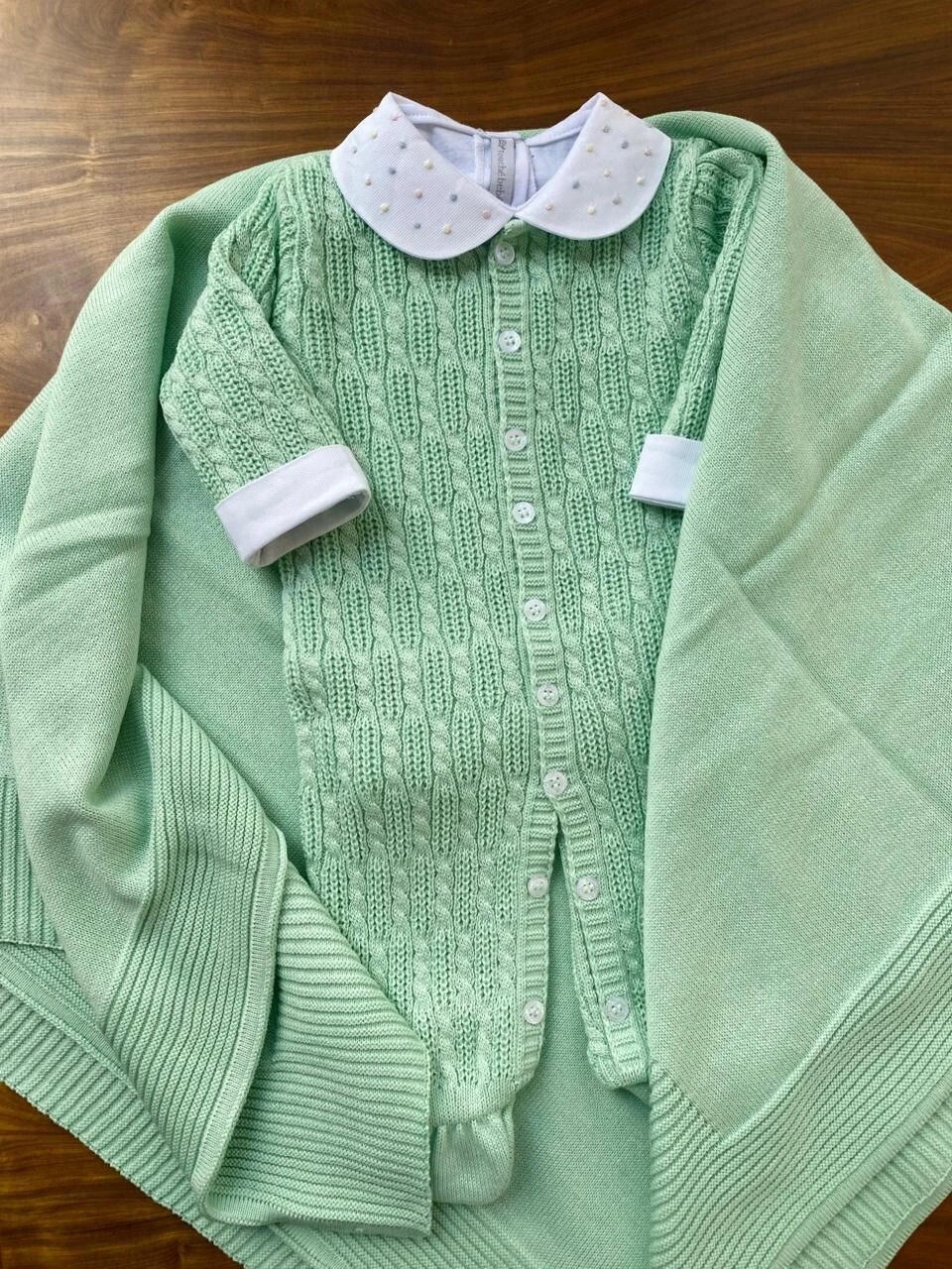 Macacão de tricot com abertura frontal, todo em ponto de tricot trança.