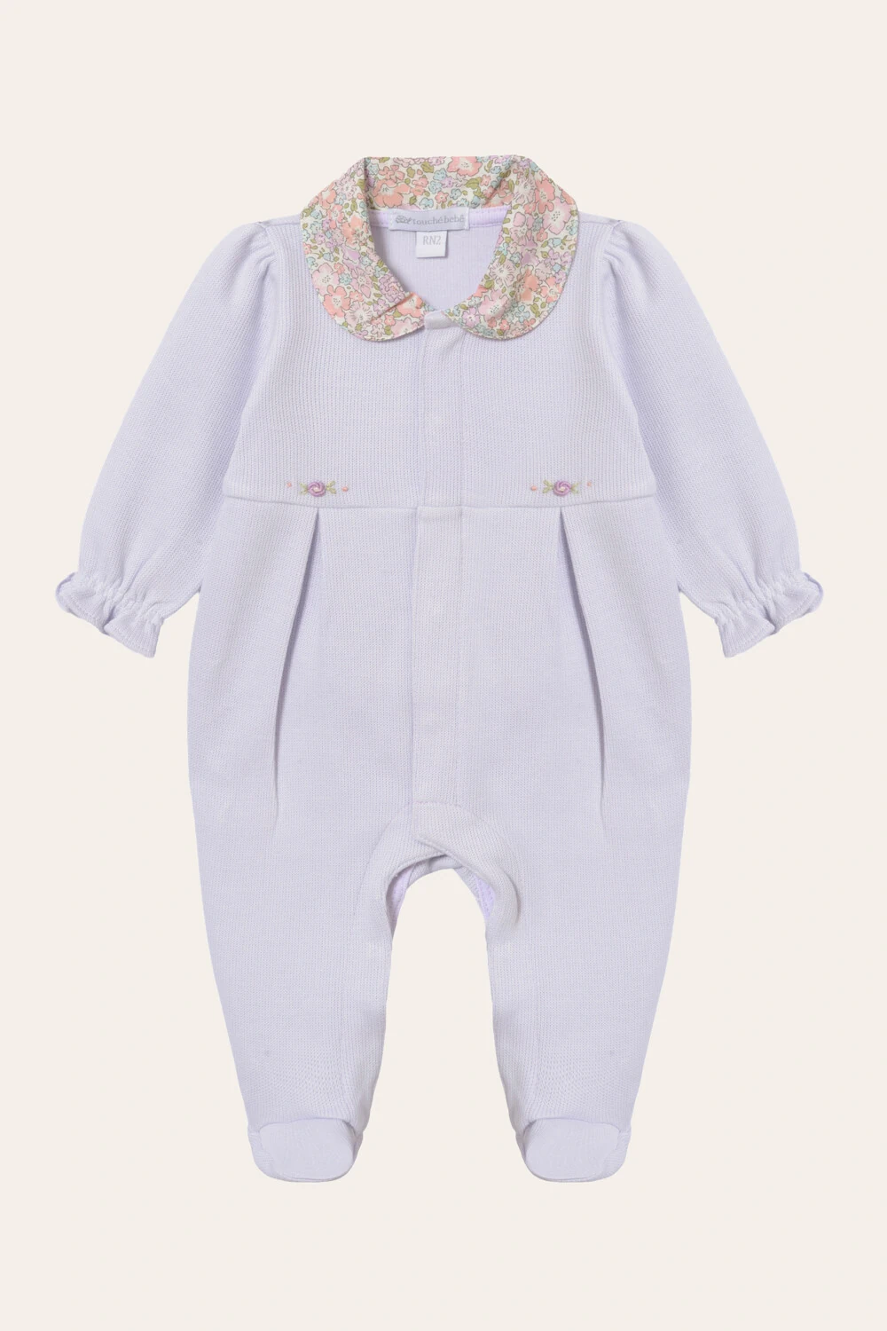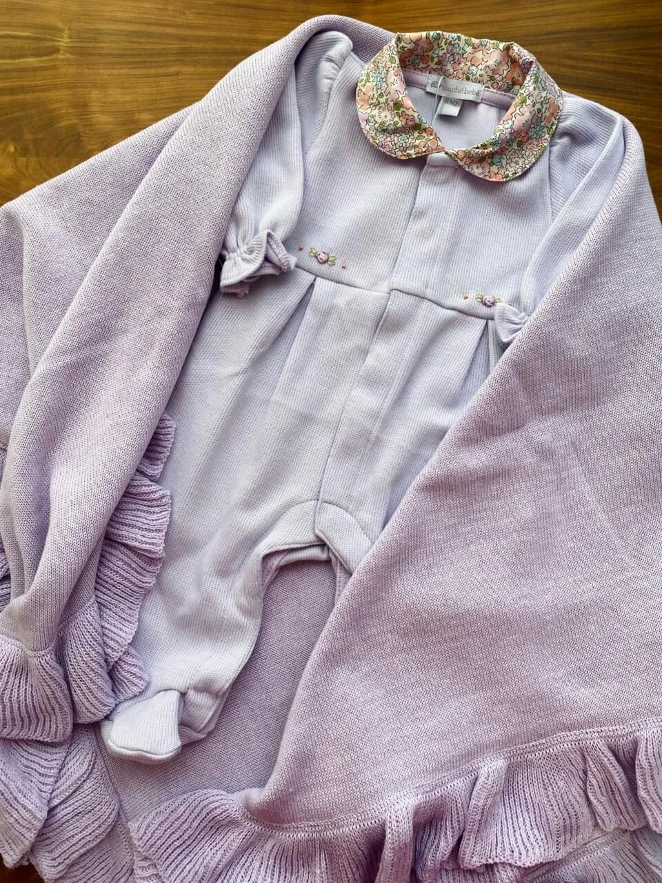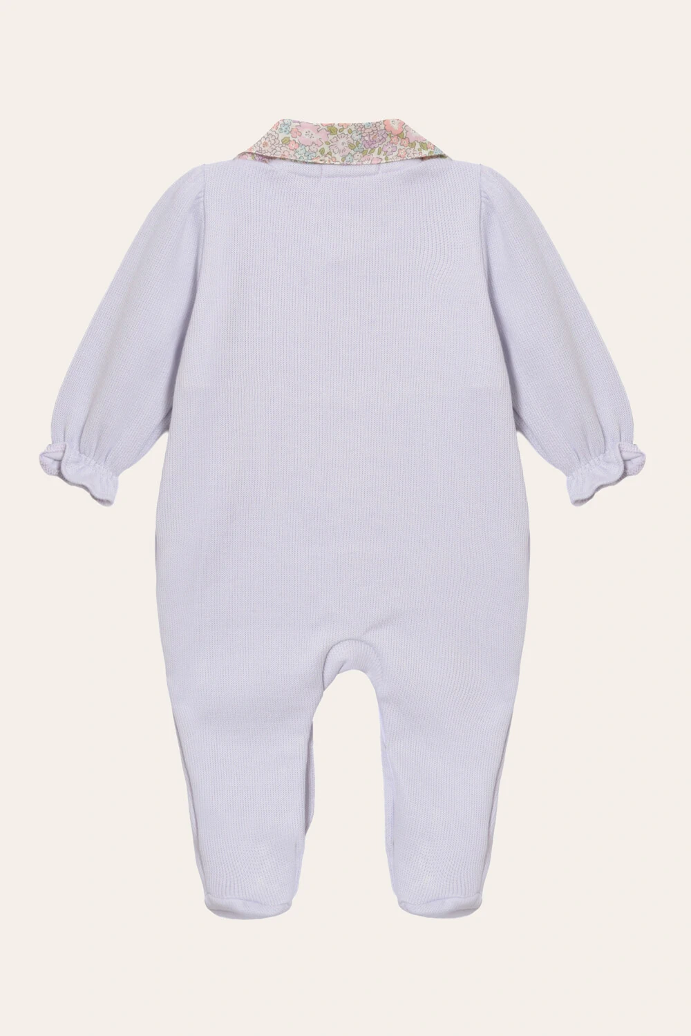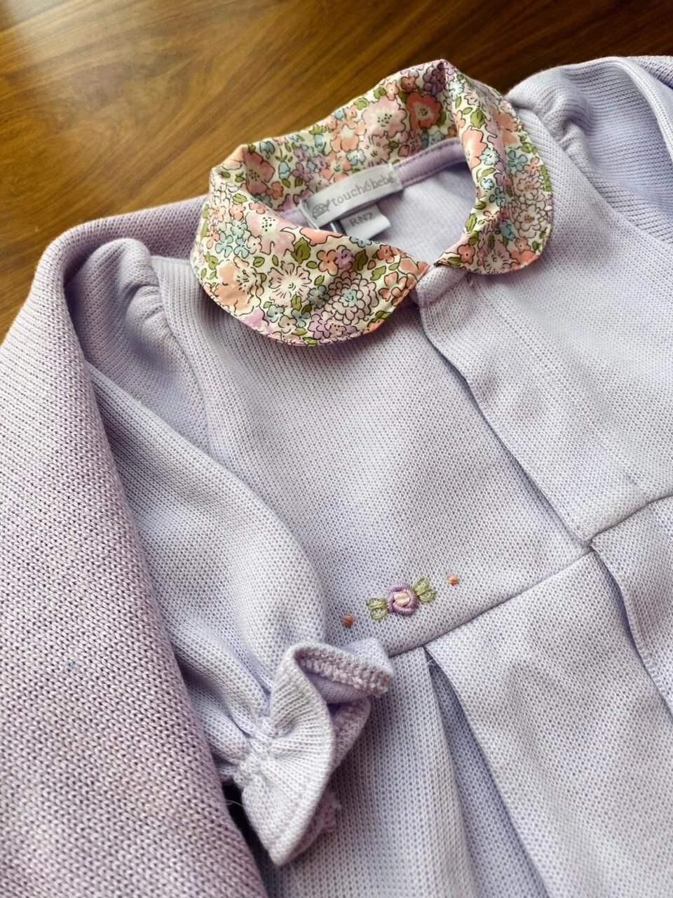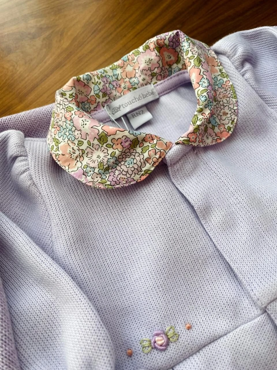 Macacão com gola liberty e rococós bordados a mão, feito em tricotil - uma malha 100% algodão que imita a trama do tricot, perfeito para quem não abre mão do toque natural do algodão mas quer muita sofisticação.