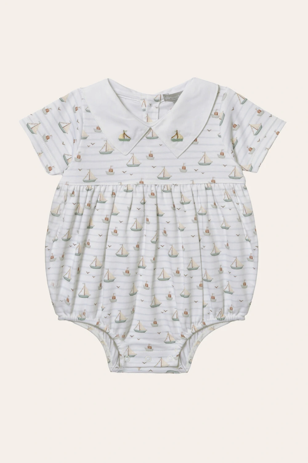Macacão curto em algodão pima - tecido com toque especial e alta durabilidade - detalhe bordado em ponto smock no peito combinando com a estampa de barquinhos da peça. Abertura de botões no entrepernas e costas.