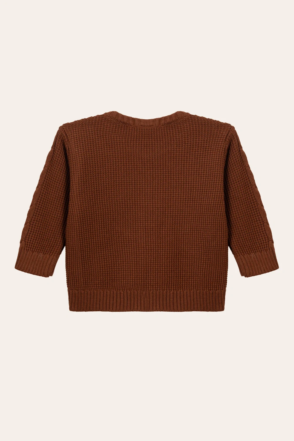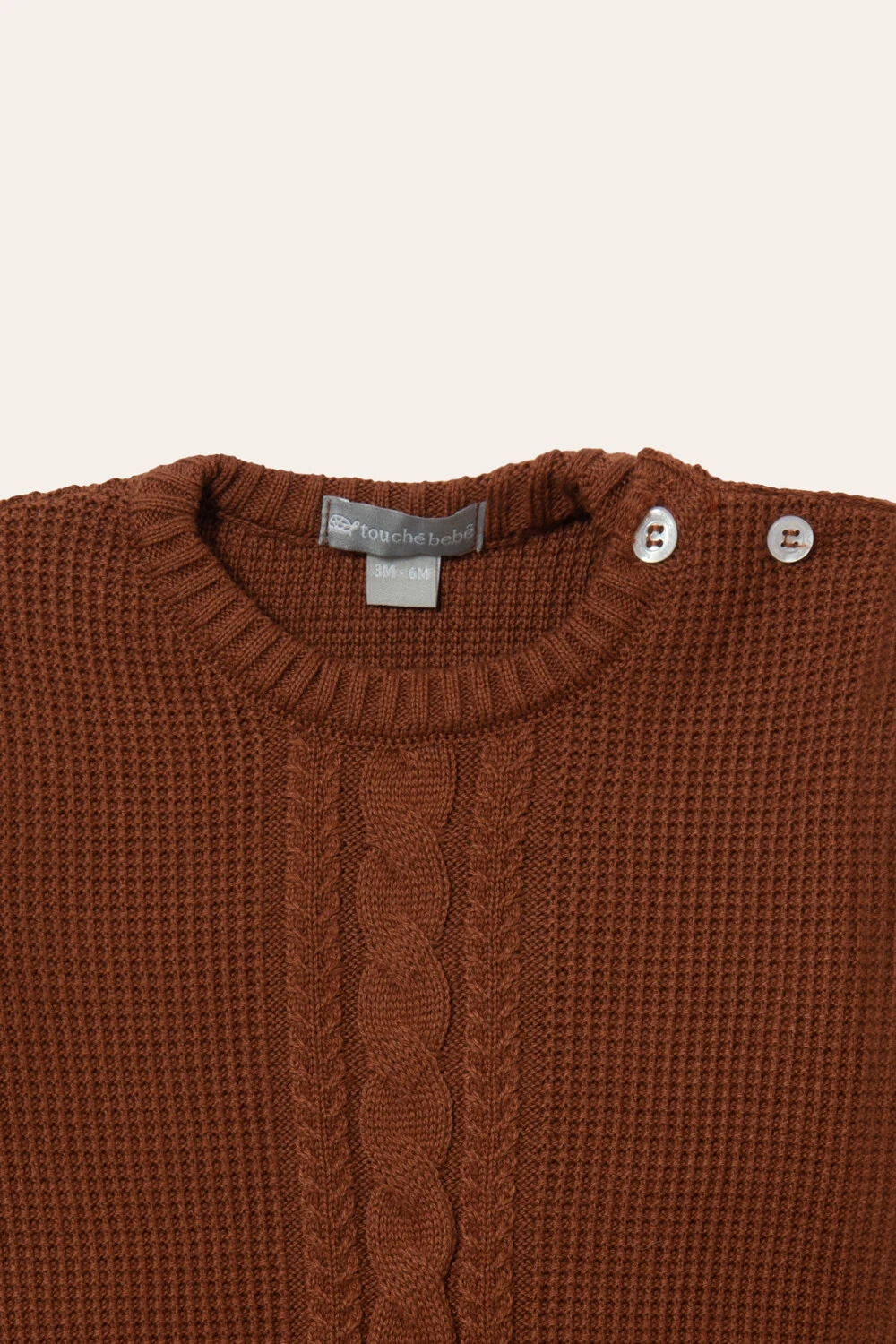 Casaco em tricot, com toque delicado e tranças no peito e nas mangas. Para facilitar o vestir: botões no ombro. Uma peça versátil para todas as horas.