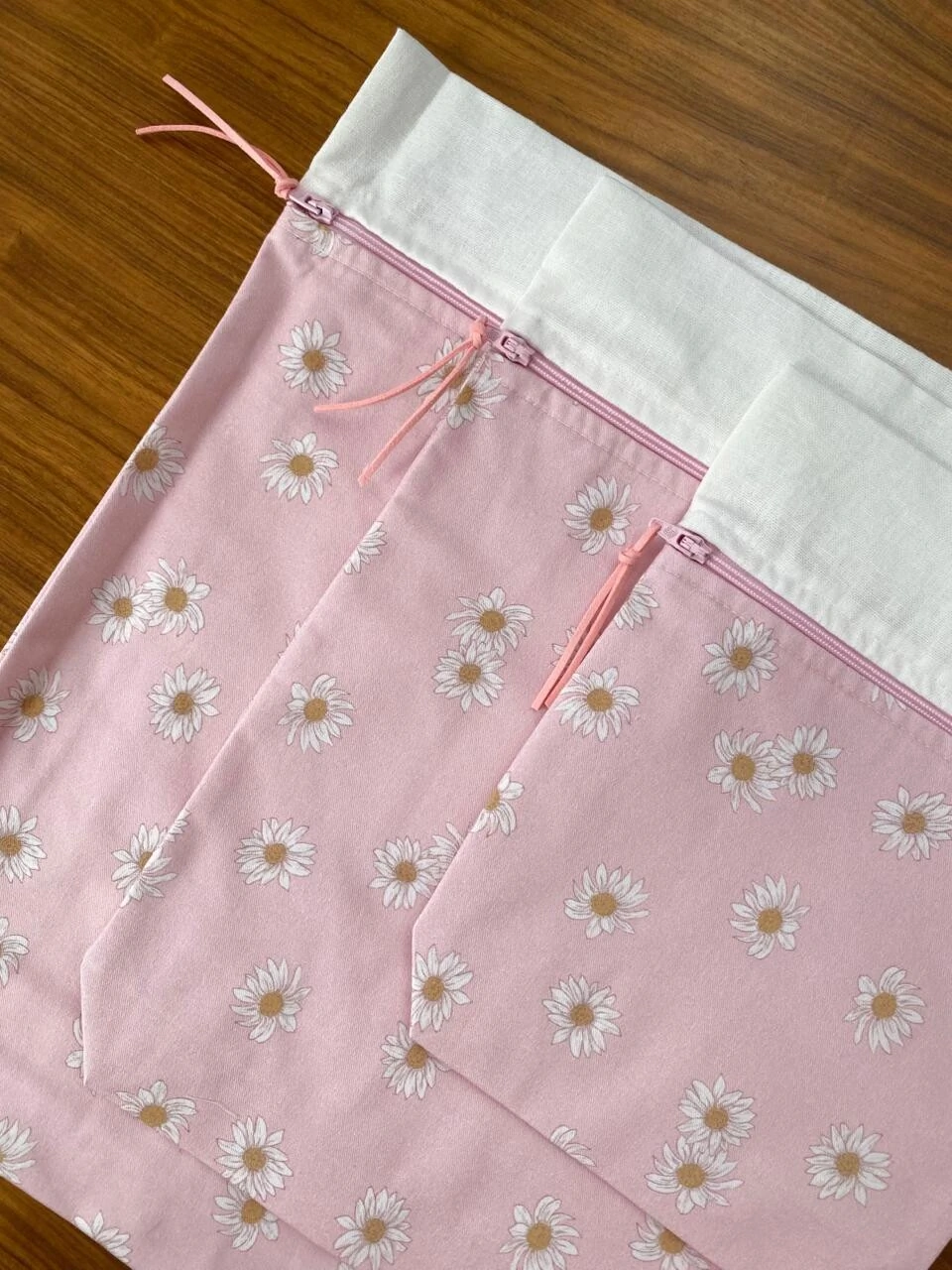 Kit saquinho estampado em sarja, com zíper e interno impermeável, em três tamanhos é perfeito para guardar e organizar as coisas do seu bebê