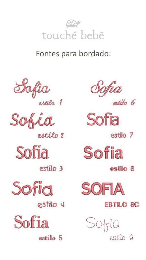 Para escolha do tipo de letra de sua personalização, observe a foto ao lado e opte pela numeração do "estilo" da fonte.